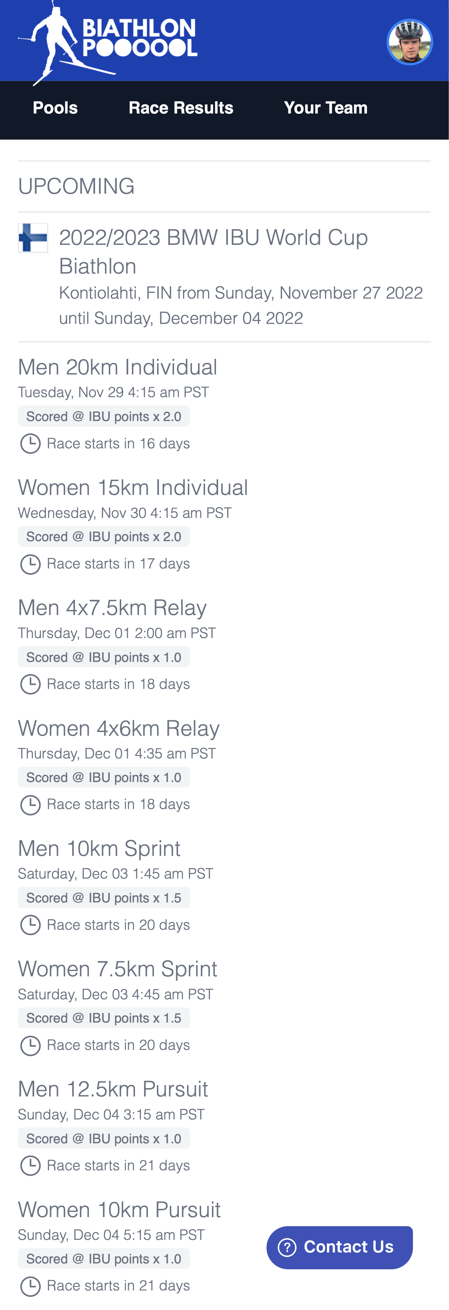 biathlonpool.com is a fantasy biathlon pool where you can compete against other biathlon fans for bragging rights. There are no fees. It's totally FREE. Create a private pool for you and your friends, or participate in the public pool with users from around the world!